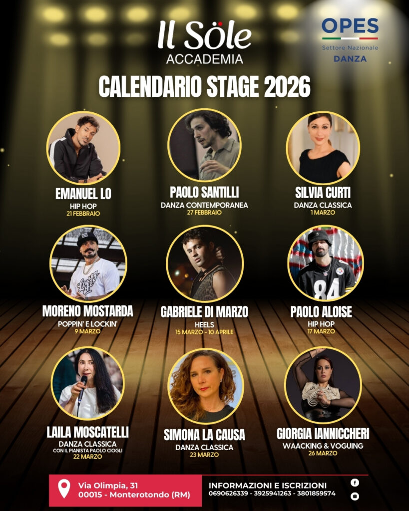 All’Accademia Il Sole crediamo nella formazione completa e nella crescita artistica dei nostri allievi, a partire dai corsi propedeutici fino ai livelli più avanzati. Il nostro calendario di stage 2026 offre a bambini e ragazzi la possibilità di apprendere da docenti di livello nazionale e internazionale, ciascuno esperto nella propria disciplina: danza classica, contemporanea, hip hop, waacking, voguing e heels.